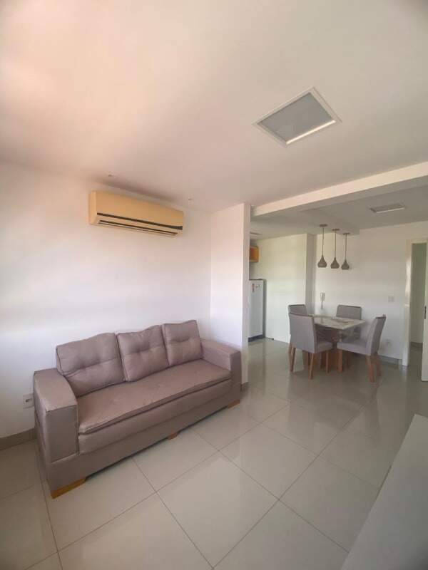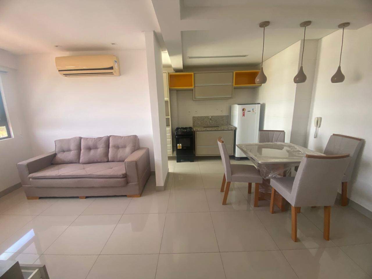 Mesa com 04 cadeiras, Sofá, Rack, TV, Geladeira, Fogão, Cama de casal e 02 aparelhos de ar-condicionado.