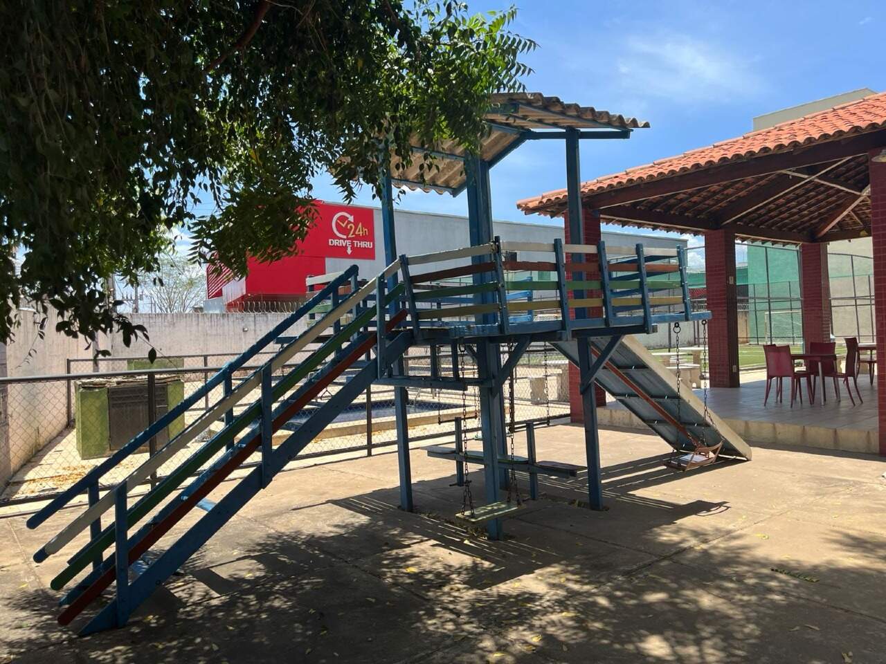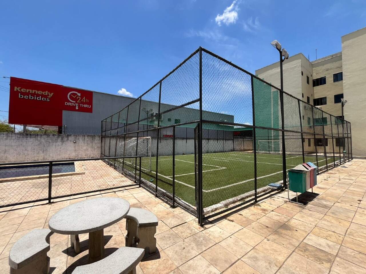 Portaria 24h, Piscina, Salão de festas, Playground, Churrasqueira e campo de futebol.